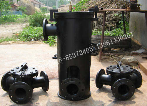 膠球清洗裝置專用分匯器是一個三通閥,通過導(dǎo)向板的切換可使膠球進入需要清洗的一側(cè)凝汽器中工作,一般一臺機組需兩臺分匯器,其進口通徑為DN100,分配口為DN100,膠球投用時可通過窺視窗觀察運行情況。